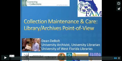 Collections Maintenance and Care from the Library/Archives Point-of-View webinar is presented by Dean DeBolt, University Librarian, Special Collections and West Florida Archives, John C. Pace Library, University of West Florida.